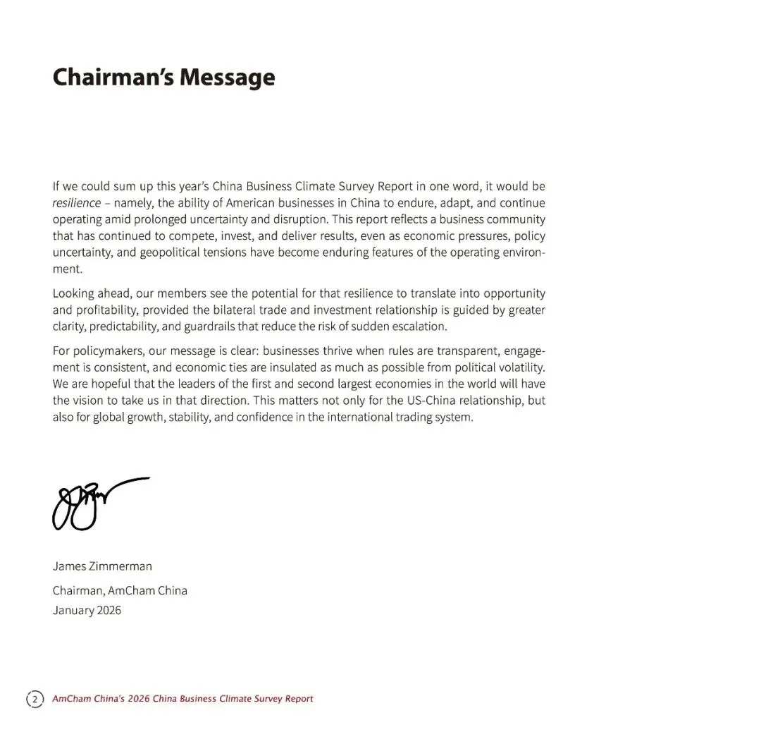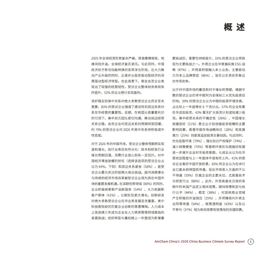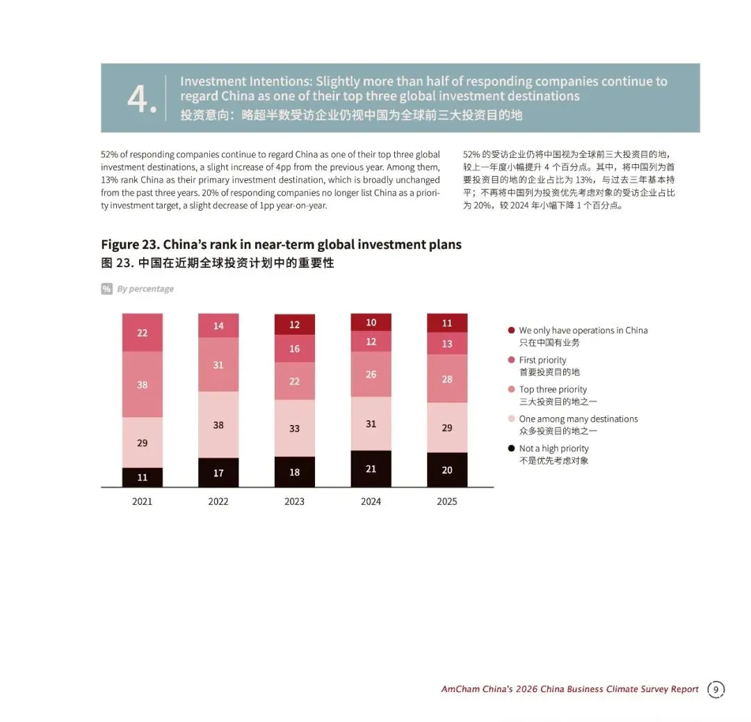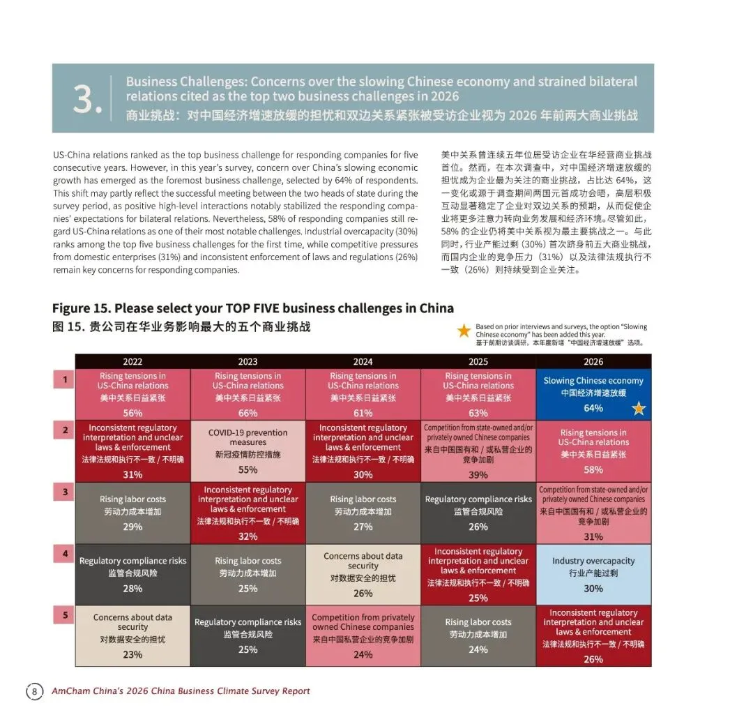 “韧性”已成在华美企最后的盔甲,却难再变成长矛。2026年调查:64%会员把“中国经济增速放缓”列为2026年第一大挑战,首次压倒连续五年居首的“美中关系紧张”(58%);虽有52%公司仍把中国放在全球前三大投资目的地,但43%已按下“暂停或撤退”键,较2024年抬升6个百分点。