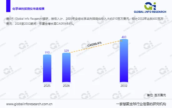 据环洋市场咨询(Global Info Research)调研团队最新报告《2026年全球市场化学战剂探测仪总体规模、主要生产商、主要地区、产品和应用细分研究报告--环洋市场咨询(Global Info Research)》显示,按收入计,2025年全球化学战剂探测仪收入大约310百万美元,预计2032年达到483百万美元,2026至2032期间,年复合增长率CAGR为6.6%。