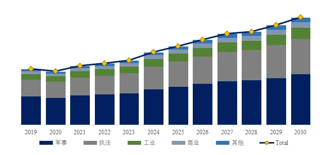 就产品应用而言,目前军事是最主要的需求来源,占据大约49.3%的份额。