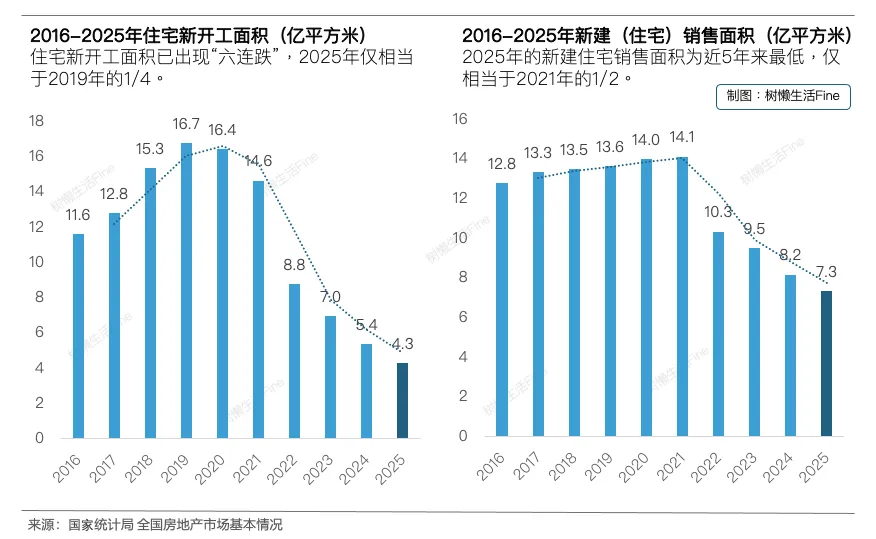 对比过往,住宅新开工面积已出现“六连跌”,2025年的总量仅相当于2019年的25.7%,回到2003年的规模。新建(住宅)商品房销售面积为近五年来最低,树懒预计,2025年新建住宅商品房销售约643万套。