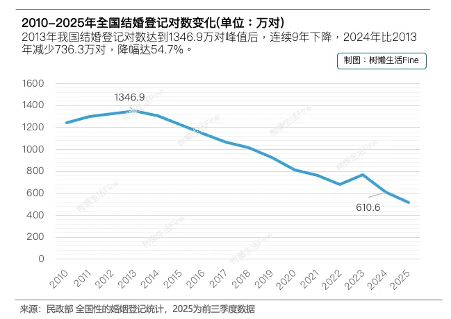 同时,我国结婚人数也接连创新低,近10年结婚登记人数下降幅度超过50%;2025年全年出生人口792万人,相较于上一年的954万人,下降幅度达17%。传统需求场景对行业的拉动持续弱化。65周岁及以上老年人口达到2.24亿人,占总人口的15.9%。人口结构变化催生的新兴需求成为行业增长的潜力。