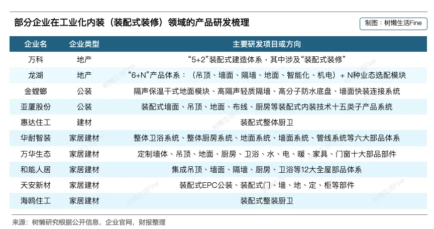 工业化内装进入“政策驱动+需求牵引+企业竞合”的加速发展阶段,房地产、公装、家居建材等多领域企业参与,各自的侧重点和产品研发方向有所不同。