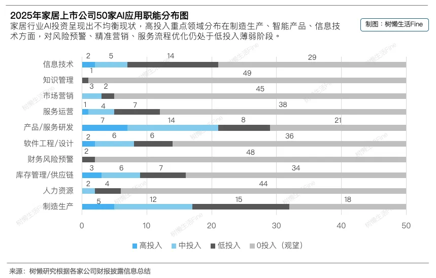 报告第二个新视角,我们对家居建材企业的AI布局进行了样本研究,50家家居上市公司中,76%的家居上市公司已将AI技术投入实际应用,剩余的12家家居上市公司虽未明确“AI",但在信息化、数字化、智能制造等均保持长期投入,推动公司经营提效,为业务智能化升级构筑新的护城河。