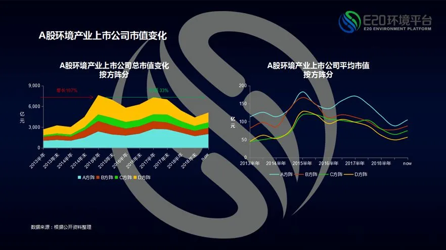这张图我在去年12月固废战略论坛展示过:从2013年上半年至2015年上半年,A股环境产业上市公司总市值一路飙升,增长1.87倍;在此之后陷入震荡波动期,并在2017年末开始急速下降;从2015年最高峰跌落至现在,跌幅33%;考虑到板块涨跌受大盘整体情况影响很大,而从这张图又无法解读出更真实的规律,我们特意绘制了另外一张图。