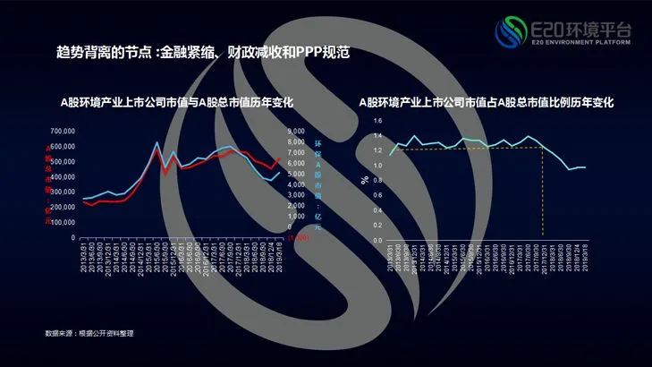 这张图将A股大盘涨跌带动板块涨跌的因素抛出在外。红色线是A股股市整体变动,而蓝色线则是A股环境产业股值变动情况。2013年至2017年末,环境产业股票处于高位上涨趋势,期间所发生的小波动也属于股票市场正常变化。但是2017年12月31号之后,环境产业股市正常波动的情况出现偏离,其下降幅度远超A股,并在发生偏离之后,并未出现明显反弹也并未回归到正常波动状态;而在今年两会前后才又重现微小上扬。这个时间点是财政部出台92号文规范PPP的时间,说明环境产业股市正常波动状态发生异常的转折点与PPP有关,而且有不小关联度,PPP的整顿甚至造成了环保股市的踩踏。许多环境产业上市公司实际并未参与PPP业务,尤其是一些PFI工程类项目,然而这些公司却受到连带影响。具体问题需要具体分析,总体而言,金融紧缩、财政减收和PPP规范导致了环保板块2017年年底以后出现股市反常跌幅状况。