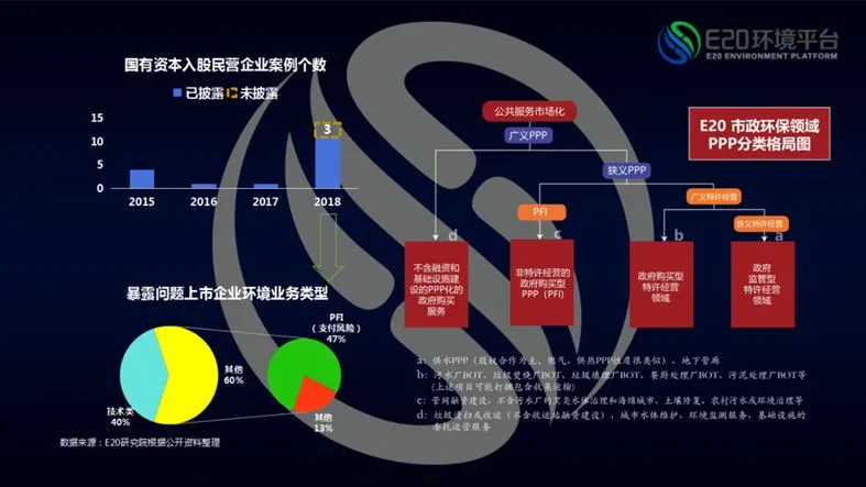 继续对近年来发生的民企(参股及控股)资金困难和由此带来的国有资本入资民企上市公司的情况进行简要分析。首先从数量上看,前几年这种情况发生频率均较低,但进入2018年以来已经超过10起,这与金融、政策等大环境变化息息相关。进一步拆分来看,2018年发生事件中40%为技术类企业,没有做任何类型PPP,也就是事件与PPP无关。而在与PPP相关的剩余60%重资产企业中,大概70%开展水环境景观工程类PPP业务,而PFI模式成为主因的比例又达到78%,这些企业在前些年PPP高速增长阶段借助承接大量PFI项目使得业绩大幅增长。但近年来金融、政策等大环境变化导致过多PFI项目在手的这类重资产企业受到较大冲击,其中民企由于融资短板而受到更大影响,才使得这类事件发生。合计评估一下,本轮PPP中新增类型--PFI模式结合资本泡沫的大起大落,确实是构成2017年以来环保领域本轮国进民退的主因,而工程类PFI退潮所引起的连锁反应更是导致环保股票在2018年出现踩踏事件的直接原因(相关阅读→ 1、 薛涛:如何做好PPP? 2、薛涛自序:在PPP落潮后下找到可持续发展的机会)。