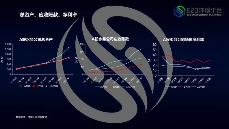 除股市震荡之外,A股水务上市公司还出现哪些变化?特许经营模式推动市政污水处理市场化并促使A股水务上市公司总资产规模快速上升,尤其是首创这类A股A方阵公司,这几年来其资产增长速度很快(相关阅读→ 杨斌:环境产业进入新时代 首创股份启动“生态+”实践)。与此同时,数据分析结果发现所有方阵企业的应收账款也在飞速增加;而相对其它方阵,A方阵水务公司应收账款上涨率更快。应收账款问题已经成为所有企业特别关注的重点。不论是重资产公司还是技术公司,所有公司的销售净利率都在下降,可见原来一些同质化的简单商业模式所能够得到的常规利润总会在红海中趋平。