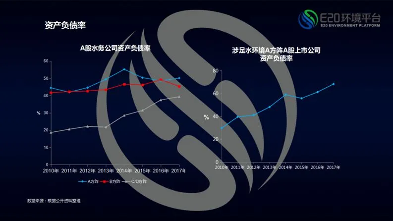 除此之外,还可以从资产负债率一端看到A股水务公司其它比较有意思的现象:地方国企类水务上市公司所受影响总体较小,甚至负债率有所下降,这是因为地方水务上市公司通过地方政府希望平台公司发挥更大作用的政策倾向中,可以获得政府资金的支持(相关阅读→ 1、粤海水务谭奇峰:粤港澳大湾区建设中的水企使命与担当;2、唐福生:未来已来,创业环保创业在路上)。A方阵公司负债率总体稳定,略有上涨,但如果我们将参与水环境业务的水务上市公司单独分析时则会发现,重度参与PFI模式的其负债率极度恶化。因为工业企业和政府的支付能力都在下降,C方阵水务上市公司的负债率也在上升。