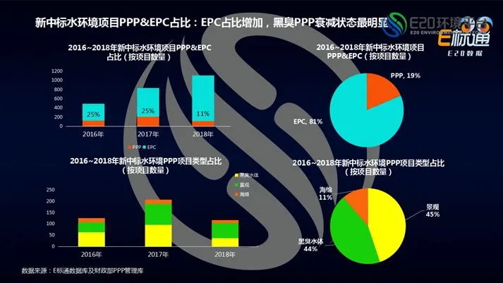 通过一组数据可以明确观察到趋势演变。E20研究院数据中心信息显示,伴随PPP规范,水环境治理市场项目竞争格局正在发生明显变化,黑臭水体EPC占比从原来75%增长至89%,而黑臭水体PPP不断衰减、PPP模式已下跌至11%,相信PPP模式占比未来会进一步被压缩。