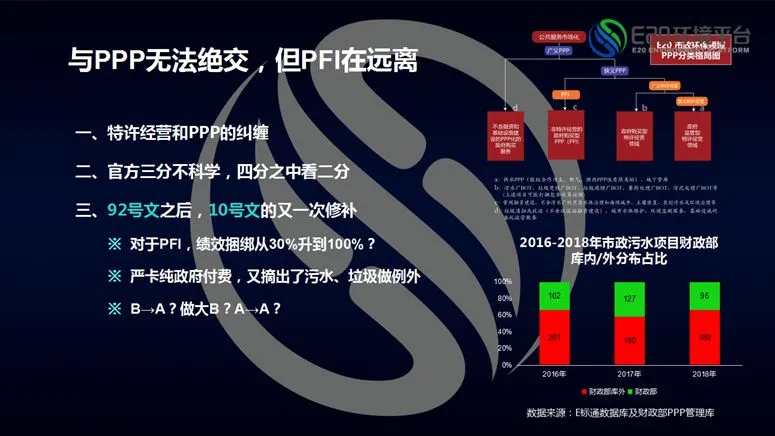 财政部官方对PPP的三分法不科学,简单而言应该为四分之中看两分,将PPP项目分为运营类项目和工程类项目区别看待。92号文之后的10号文很重要,10号文应该是财政部第二次重大修补,不像以前的文件,这个文件阐述了更多关于环保的内容。10号文有实质大于形式的说法,也为PPP带来很多不可控因素。10号文开始修正分类的不合理性,文件明确要严格约束政府付费,同时却将污水垃圾从政府付费类限制中拿开(相关阅读→ 财政部重磅发文规范PPP发展,对环保相关领域有哪些影响?)。