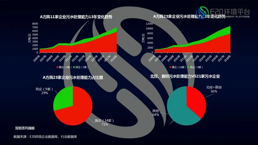 国企民企在污水处理市场占比又是另外一种情况。如果将企业抽样样本锁定在11家,则国企比例在逐年上升;假如将企业抽样样本扩大至23家,则国企虽然规模增加,然而民企所占比例却在上升,也就是中小规模污水处理特许经营企业所获得的市场份额并不低。另外,北控、首创占比市政污水处理市场总能力36%(相关阅读→ 北控水务李力:行业影响力企业发展理念的思考和实践)。