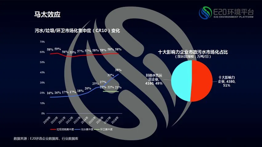 生活垃圾焚烧市场正好处于特许经营中后期,截至目前,生活垃圾焚烧行业前十家的集中度大概在58%左右。环卫行业处于市场化早期,目前集中度还很低。污水处理市场行业集中度在2015年后开始增加,未来这一比例还会继续攀升,然而尚不能达到垃圾焚烧58%的集中度。