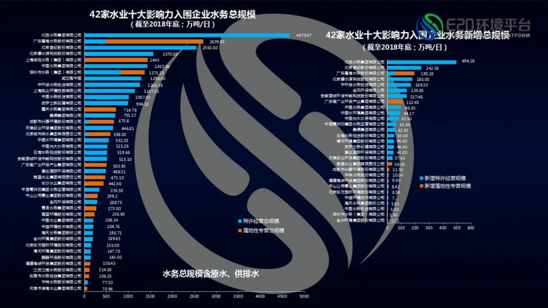 另外两个排行榜分别是42家十大影响力入围企业水务总规模与新增规模,并把政府直接授予的项目规模从企业业绩榜中分离出来,北控水务、首创股份新增量分别为494.28万吨/日、242.38万吨/日。