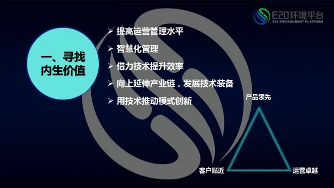 我依然认为,技术企业如果在产品领先和客户贴近上找到自己的优势,依然可以找到与重资产公司也就是与A方阵长期生态合作的机会(相关阅读→ 1、清研环境刘淑杰:RPIR技术创新之路;2、赛诺水务张岩岗:适合自己的路,才能行远弥坚)。因此,技术型企业一定要在创新上具备优势,而这类企业往往是民企且是中小规模企业,也属于今天发言的技术领先型企业。只有如此,在探寻内生价值时,重资产公司或者CD方阵公司都会获得技术推动模式创新的机会(相关阅读→ 1、合续环境李文生:技术升级带动行业标准化2.0时代;2、翰祺环境郭永伟:依归技术初心,专注解决难题)。