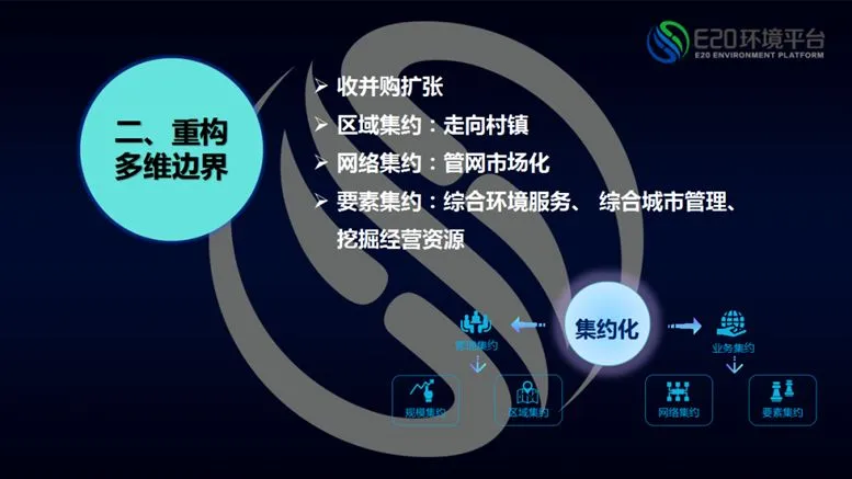 市场扩张的另外一个发展方向在于重构多维边界,具体有四种实现方式:收并购扩张、区域集约、网络集约、要素集约。收并购扩张也是多维边界的合作方式,其余三种我在去年固废战略论坛谈到过,也是基础设施集约化的几个方向(相关阅读→ 岭南水务李恒山:因水缘聚 引“岭”未来)。前文所展示的市场化特许经营比例和市场化规模增长以及由此所形成的马太效应,仅涉及傅老师所讲的环境治理中点源治理部分。而如果要涉及面源治理则一定要考虑如何做到区域集约、网络集约以及要素集约。走向乡镇环境治理是区域集约的一个方向,而管网市场化涉及的厂网一体化,也涉及以何种商业模式才能被企业承接;要素集约则包括综合环境服务、综合城市服务和挖掘经营资源(相关阅读→ 商达环保郑展望:以“以用为本”的后端运维视角构建农村污水治理整体方案)。