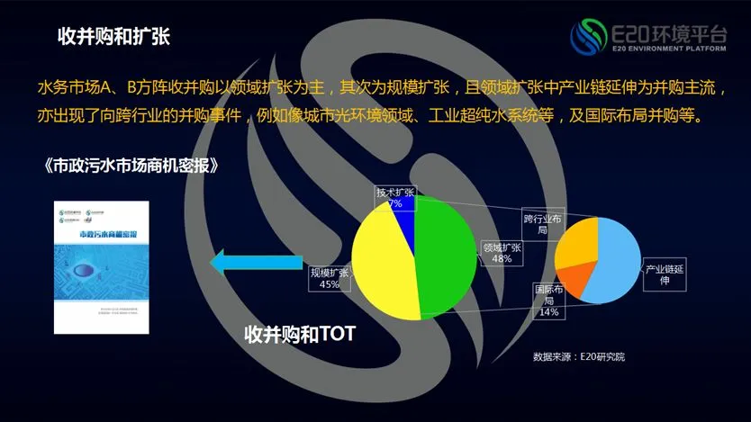 在统计2018年A、B方阵上市公司及大企业收并购情况时发现,并购方向涉及领域扩张、规模扩张和技术扩张。领域扩张包括跨行业布局、国际布局和产业链布局。除此之外,还有规模扩张,也就是通过收并购实现传统市政污水处理规模增长。E20研究院数据中心借此还将发布仅供A方阵圈层企业参考的《市政污水商机密报》,该报告将会对传统污水处理存量市场诸省展开分析,以期为圈层企业并购提供寻找方向。