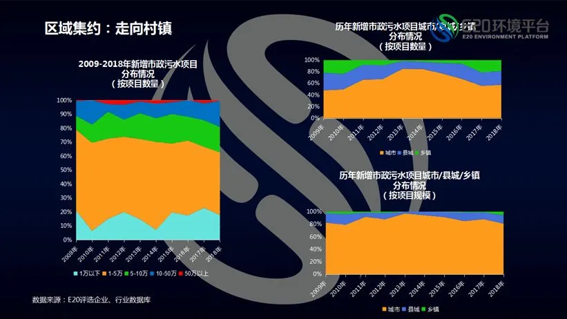 在分析区域集约走向村镇时,通过数据统计可以发现近两年污水处理增长的明显趋势:或者50万吨/日以上污水处理厂获得微小增长,或者A方阵企业将触角延伸至镇级5万吨/日及以下污水处理厂。做一个形象化比喻,也就是在传统污水处理市场中,品质良好的大块肉快被分食完毕,企业开始以兔肉为食。