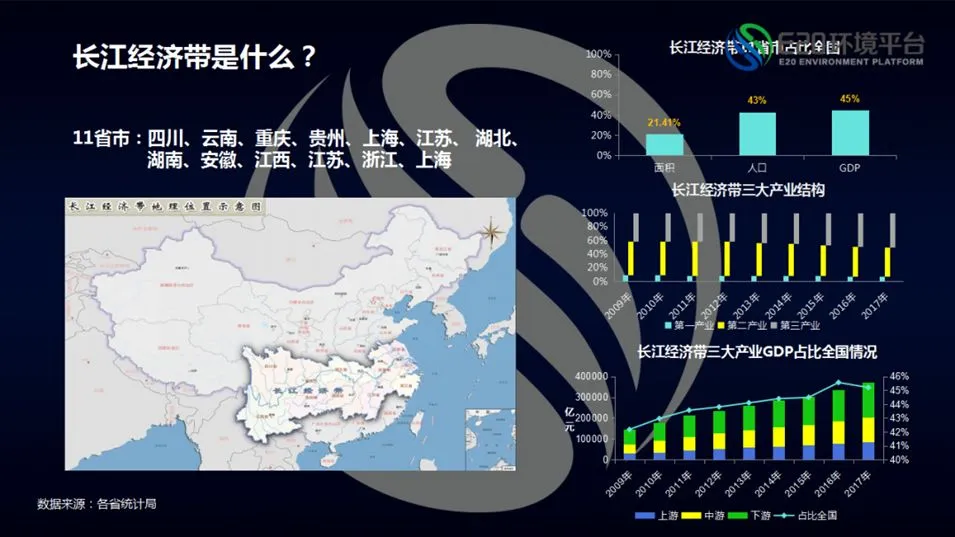 首先回顾一下长江经济带究竟是什么,可以看到长江经济带11省市人口、产业结构和GDP分布情况。面积仅占21.4%,人口与GDP占比全国却达43%、45%;伴随产业结构的调整与升级,长江经济带三大产业,第二产业比重在不断压缩,第三产业比重在不断上升;而不到十年间,GDP占比全国比重上升了3个百分点左右。