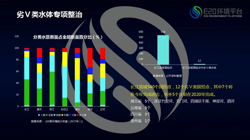 首先是断面不达标的消除。从水质断面观察,长江流域III类(含)水质以上断面比例超过80%,但在540个国控点中仍存在12个劣V类国控点,分别位于湖北省、云南省、四川省、贵州省(相关阅读→ 博汇特潘建通:地表准Ⅳ类出水生化工艺的探索实践)。