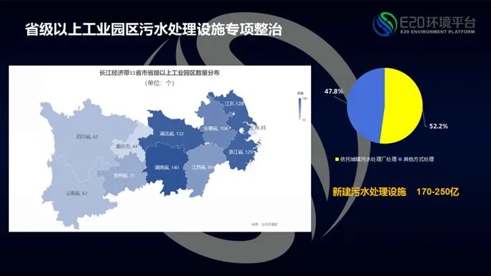 工业园区的治理亦是长江大保护的重点。据不完全统计,2017年长江流域有超过一半的工业园区依托城镇污水处理厂进行处理,这部分污水处理需求有逐步独立建厂的趋势,经过简单计算,大概带来170-250亿之间的一个工业园区新建污水处理设施的市场潜力,此外,湖北、湖南、江苏、浙江是工业园区相对较为聚集的省份,市场需求释放速度会相对较快。