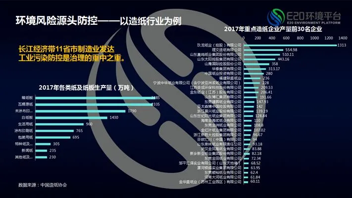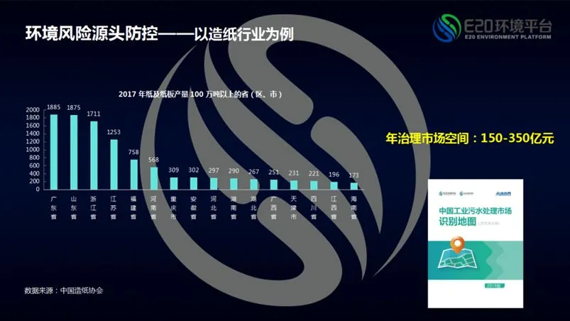 不仅仅要看园区、看市政,工业企业水的治理需求也在长江大保护中汇总得到释放,拿造纸来举例,2017年11省市各类纸及纸板生产量超过1亿吨,广东、山东、浙江、江苏四省年产量超过1000万吨,由此带来了大量的造纸废水的治理需求,据简单测算11省市年造纸废水治理的市场需求在150-350亿元。E20研究院也会发布《中国工业污水处理市场的识别地图》,且会分领域逐步推出,用于给工业企业的会员寻找在长江以及其他省市的项目机会。