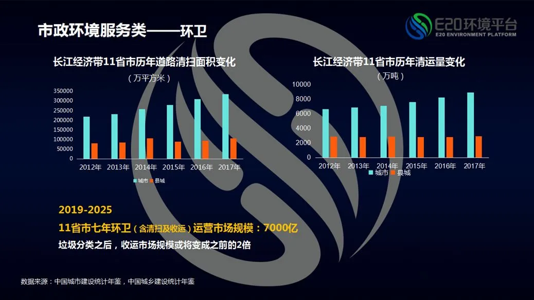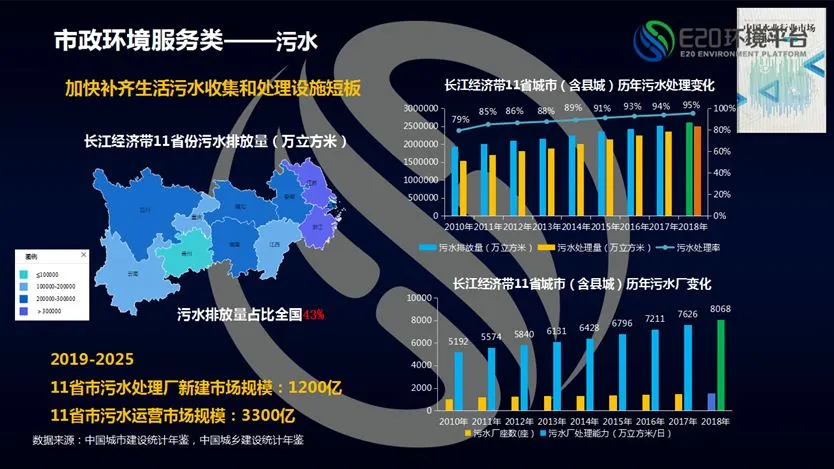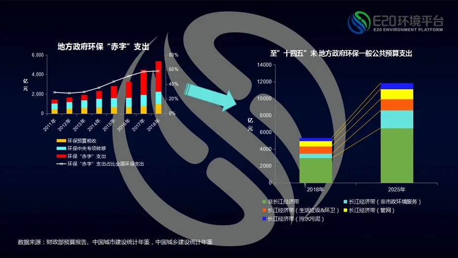 2018年长江经济带市政环境治理能够实现资产化和运营价值的项目规模大概在2200亿左右,2025年要达到长江大保护的治理要求,则所需资金至少翻一倍,这些都是政府需要支出的情况。