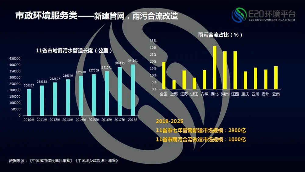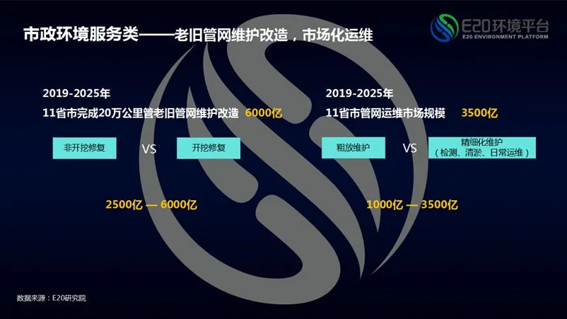 如果为实现水环境整体改善、实现厂网河一体化,按照高标准运营维护管网,则管网面临大幅更新、维护或是提升的市场需求;其中包括新建管网、雨污合流、老旧管网维护(一般简单的开挖与非开挖结合情况)以及精细化维护。现在至“十四五”末,11省市管网新建市场规模为2800亿、雨污合流改造市场规模为1000亿、老旧管网维护改造6000亿、管网运维3500亿。