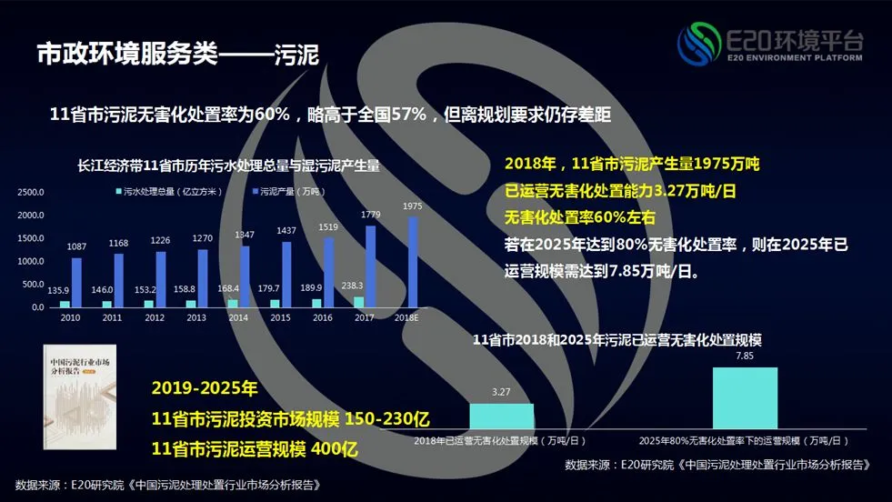 据E20研究院《中国污泥处理处置行业市场分析报告》数据显示,2018年11省市污泥产生量达到1975万吨,已运营无害化处置规模3.27万吨/日,无害化处置率达到60%左右,高于全国整体水平。预计现在至“十四五”末期,污泥的整体市场规模或将超过600亿元。(包括投资及运营)。具体分析可以参考我们的污泥市场报告。