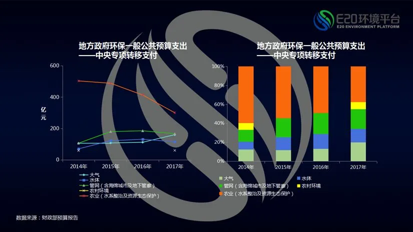 将中央专项转移中与环保相关的支出进行分类后发现,大概包含5类,分别为大气、水体、管网(含海绵城市及地下管廊)、农村环境、农业(水系整治及资源生态保护);特别指出,近几年在中央专项转移支付基建支出科目中也有环保相关支出,并未在此特意列明。数据分析分项总额及结构性占比趋势如图所示。