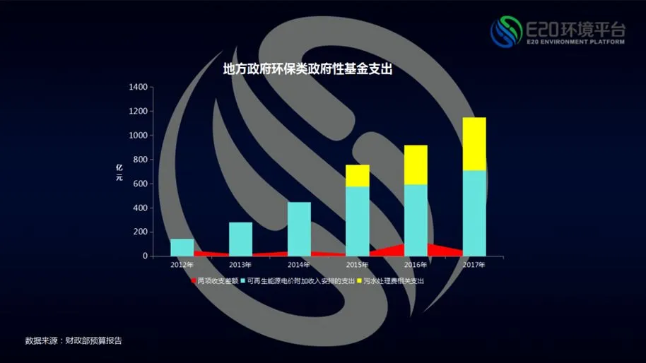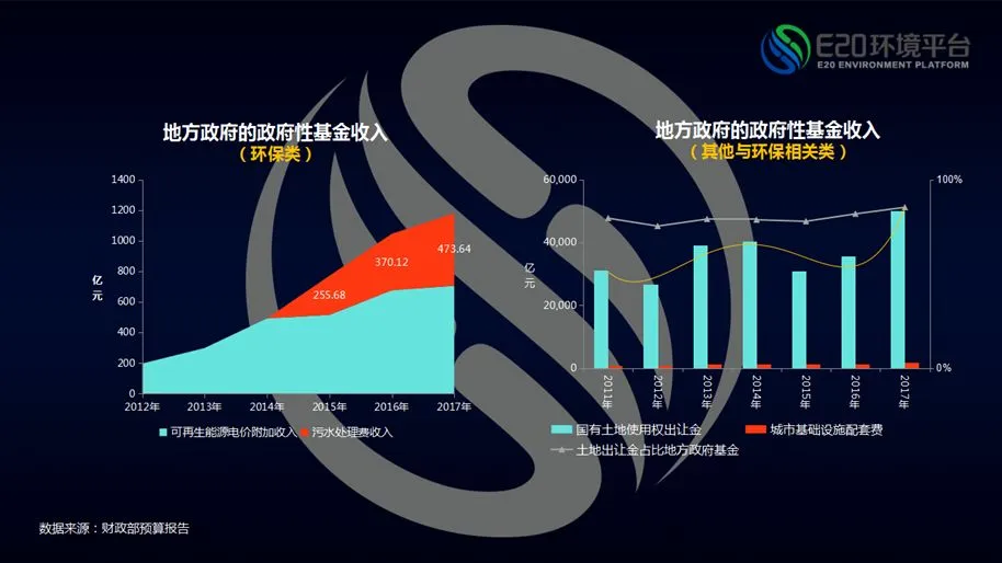 在国家基金账本中,与环保直接相关的为废弃电器电子产品处理基金收入、国家重大水利工程建设基金收入、国有土地使用权出让金收入、可再生能源电价附加收入、城市基础设施配套费收入、污水处理费收入。在这几类中,废弃电器电子产品处理基金收入为中央收入、国家重大水利工程建设基金收入为中央地方共享收入,剩余几类均为地方政府基金收入。