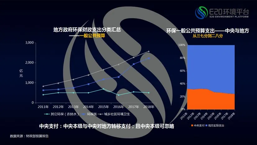 而在地方政府环保支出中,中央转移支付占比却急剧下降。该变化也与国家宏观政策环境息息相关。《国务院关于改革和完善中央对地方转移支付制度的意见》国发〔2014〕71号明确要完善一般性转移支付、从严控制中央专项转移支付;而中央对地方环保支出主要通过专项转移支付。除此之外,2015年新环保法开始正式实施,新环保法把地方政府作为环境的一级责任主体,这几年不断加压。在2015年之前,中央环保支出与地方环保实际支出所占比例呈现稳定状态;在宏观财政政策及环保政策变化背景下,而中央对地方转移支付的环保支出从2014年开始逐年下降,在中央的钱投入总额基本不变的情况下,现在总共的环保一般公共预算支出,地方已经从三七变二八,中央的钱没有变,地方多花了15%的钱。
