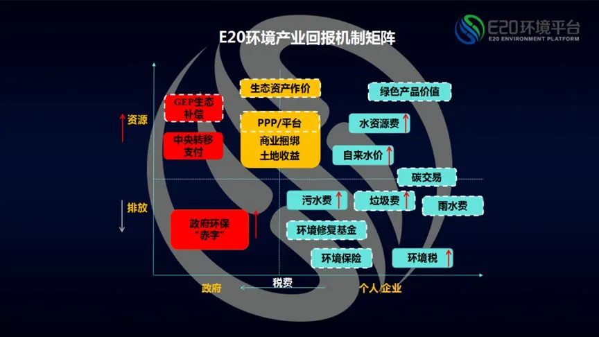 右边蓝色部分涉及价费机制,政府通过向老百姓或者企业收费,或者后两者为生态附加值的主动付费,来解决资源价值提升或者降低污染物排放。