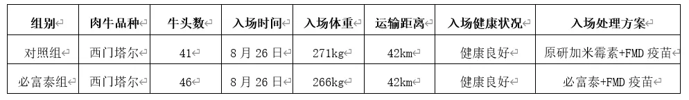 从同一交易市场采购西门塔尔架子牛,依据牧场分圈标准随机分为两组,入场后统一打耳标记录身份信息,除预防BRD药物使用必富泰与原研加米霉素的差别外,其他其它饲养管理条件保持一致,FMD疫苗同一厂家,确保试验的公平性与可比性。试验牛群信息如下表: