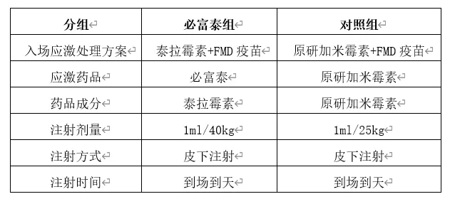 内蒙东部地区某规模化牧场位于通辽市开鲁县,地处牛羊交易市场核心区域,该牧场存栏1500头,以过渡牛养殖与交易为核心业务,自交易市场采购的牛,经历频繁的运输应激易引起牛呼吸道疾病高发,并伴随复杂的其他疾病症状,因此该牧场高度重视牛群运输应激方案的实际效果。为优化入场应激管理方案并节省用药成本,牧场针对处理应激产品方案展开对比试验,选取百美达-必富泰(泰拉霉素)与某知名外企-原研加米霉素为试验产品进行横向对比。
