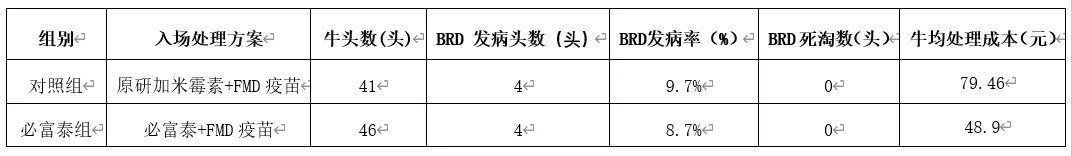 1. 通过跟踪分析不同药物处理后的两组牛发病数据,入场使用必富泰做全群预防的牛群,BRD发病率略低,后续BRD发病牛的治疗疗程更短,药费投入降低38.5%。说明必富泰的使用可获得与原研加米霉素产品几乎一致的预防BRD效果,同时可以大幅度的降低用药成本,达到节本增效的预期目的。