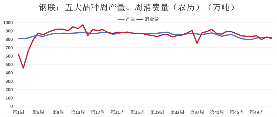五大品种钢材(螺纹、线材、热卷、冷轧、中厚板):总产量微增(819.6万吨,+0.4万吨),总需求量减少(809.5万吨,,-16.6万吨);