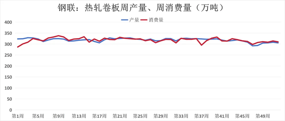 热卷(板材代表):产量微降(305.4万吨,-3万吨)需求量微降(310万吨,-4.2万吨);