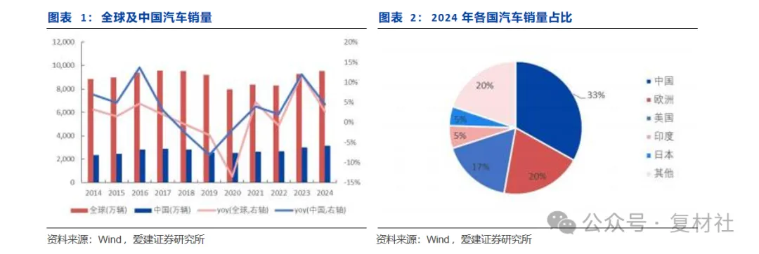 政策驱动叠加需求释放,中国汽车销量位居全球第一。2024 年全球汽车销量9,531 万辆,其中中国汽车销量 3,144 万辆居全球第一,占比 33%。中国新能源汽车行业升级,叠加消费需求释放,2014-2024 年销量 CAGR 89.3%。新能源乘用车行业加速向全球化、高端化升级,规模效应带动产业链边际成本摊薄,伴随出口市场扩容及消费升级,新能源乘用车渗透率增长动能强劲。我们预计 2025 年新能源乘用车销量将突破 1538 万辆,增速 26.0%,渗透率 52.9%,2025-2030 年销量 CAGR 将达 15.3%。