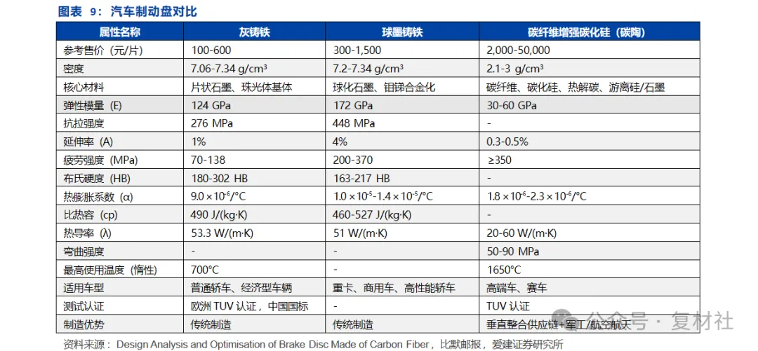 主流灰铸铁制动盘成本低,但密度高、热衰退劣势明显。目前,汽车主流制动盘采用灰铸铁等材料,但存在高重量、易热衰减及耐腐蚀性不足等劣势,拖累续航能效表现。当连续制动时,灰铸铁盘表面温度超 500℃时易发生珠光体分解,引发热疲劳裂纹,摩擦稳定性受损,难以满足高端电动车的性能追求。