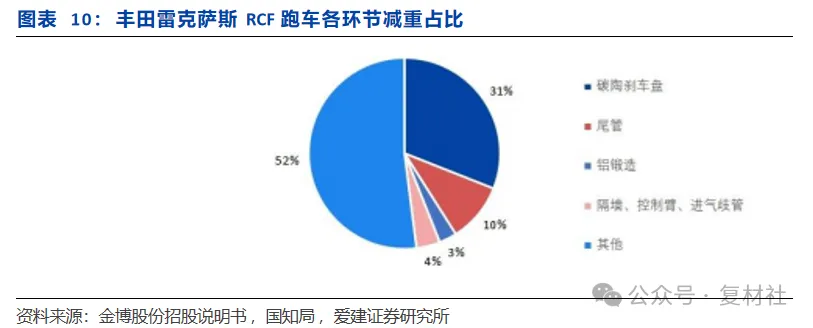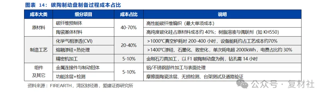 上游原材料成本占比超 40%,碳纤维为最大单项支出。碳陶制动盘的成本构成中,原材料为核心成本,其中高性能碳纤维编织为最大单项成本,高纯度纳米级碳化硅消耗量约为原材料成本的 40%;制造成本中高温处理环节成本占比 50%以上,高能耗设备推升电费与维护费用;组件成本占比较低,规模化后成本递减。