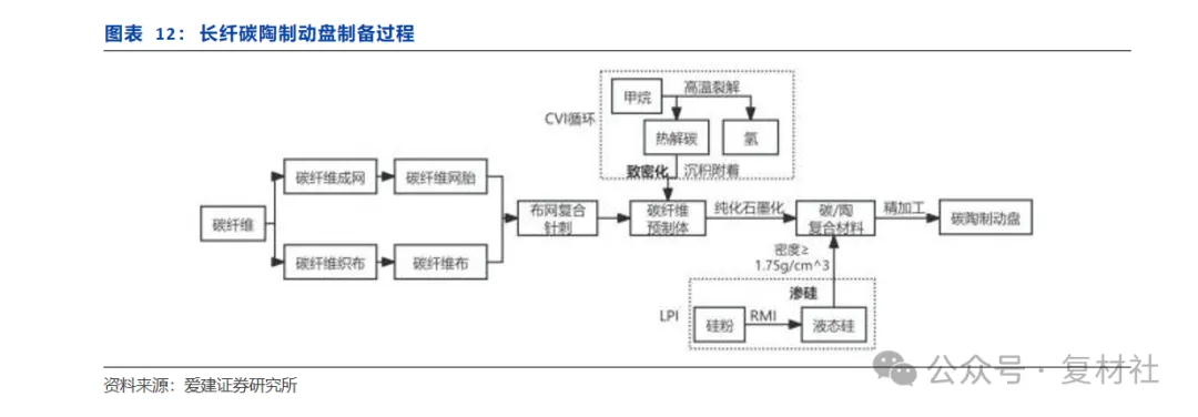 工艺是技术壁垒最集中的核心环节。中游制造工艺决定产品性能、良率与成本,主要包括 CVI(化学气相渗透)与 LPI(液相渗透)技术,CVI+LPI 组合路线是当前主流工艺,先通过 CVI 初步渗透提高结构均匀性,再用 LPI 快速补充致密度,加快孔隙填充速度,提高成品率和工艺效率。因控制精细度与性能要求高、渗透深度与均匀性难度大、不同车型差异,主机厂对新材料供应商定点认证周期长、技术替换意愿低,具备先发优势公司更易率先绑定头部客户享受增量红利。
