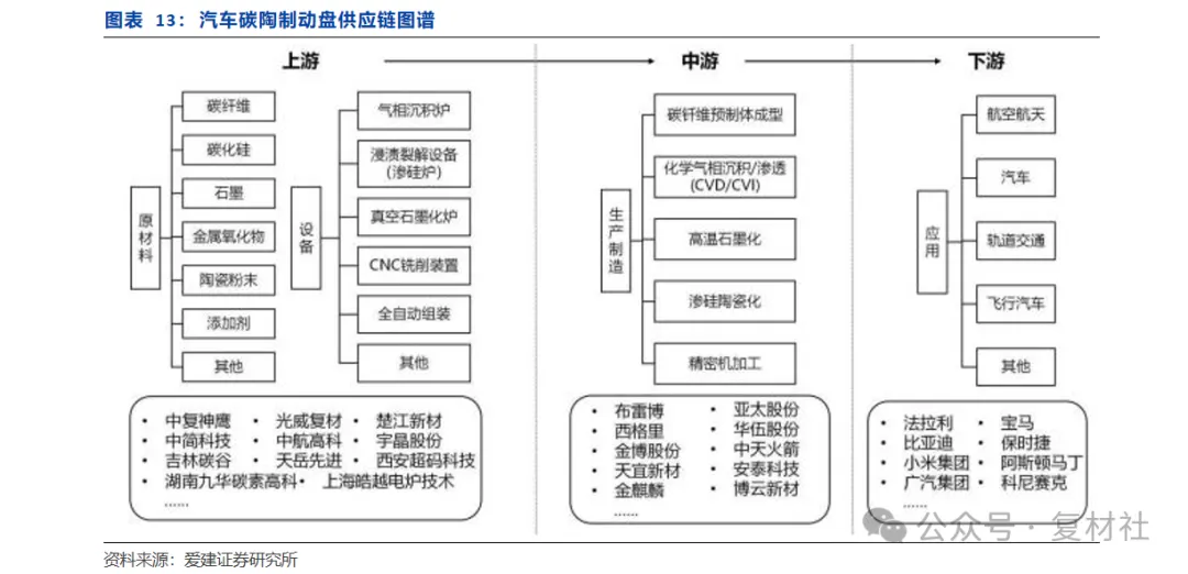 碳陶制动盘产业呈现三段式价值链分布结构:上游原材料供应与设备、中游制造加工以及下游应用。上游原材料供应环节聚焦于关键材料的基础保障,上游主要涉及碳纤维、陶瓷粉末等原材料的提取、采购与初步加工;中游制造加工环节以先进工艺驱动技术创新与降本,包括预制体制备、陶瓷化处理(化学气相渗透 CVI、液态聚合物渗透 LPI 或其它组合技术)等关键流程;下游终端应用覆盖航空航天、汽车、轨道交通及新兴领域,产业需求多元化增长。