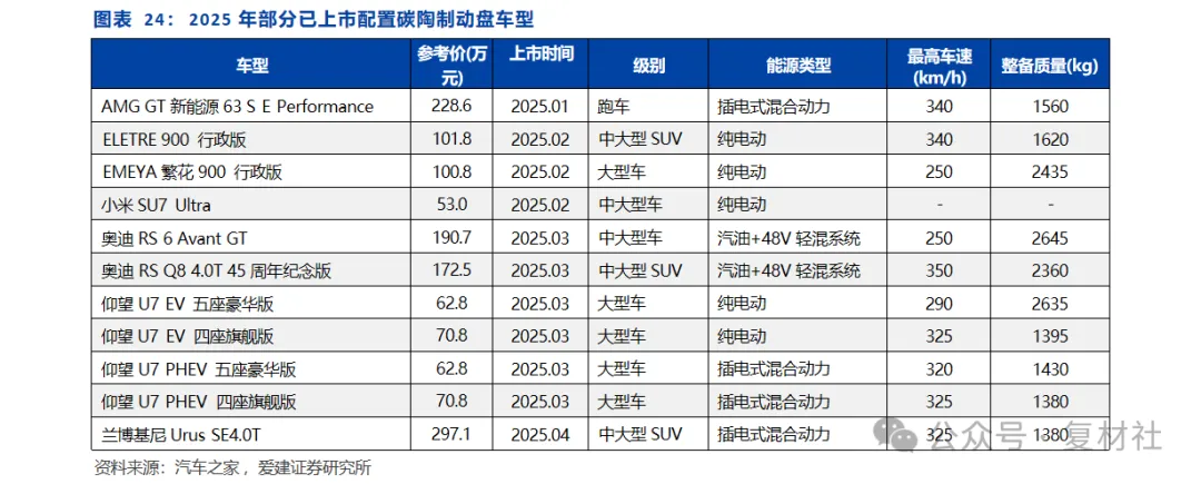 下游汽车领域增速加快。从应用下游看,2025 年部分标杆车型(如小米 SU7 Ultra)大规模搭载碳陶制动盘作为核心配置,其示范带动效应将加速在中高端车型配置的普及,实质性打破此前碳陶制动盘局限于顶级超跑的小众市场格局,提升在消费者和主机厂中的认知度和接受度。