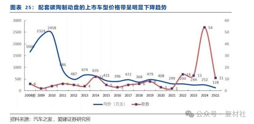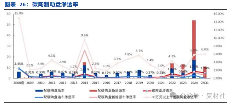 规模化放量前夜,低渗透率与配置趋势形成预期差。2008-2023 年,碳陶制动盘仅局限在每年 15 款以内超豪华跑车,2024 年车型数量迅速攀升至 54 款,配置车型均价由 2000 万元级别下探至 128 万元,2025 年最新搭载小米 SU7 Ultra价位为 50 万元级。碳陶制动盘在乘用车市场渗透率仍处于约 1%的极低水平。我们认为,2024 年起价格下沉与车型配置数量陡升,预示着规模化应用拐点临近。