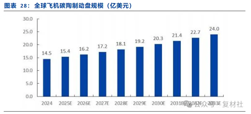 全球增长洞察预计 2030 年全球飞机碳陶制动盘市场空间约 20.3 亿美元。根据全球增长洞察数据,2024 年全球飞机碳陶制动盘市场价值为 14.5 亿美元,预计将以 5.7%的年复合增长率增长,2025 年将达到 15.4 亿美元,2033 年将达到24.0 亿美元。