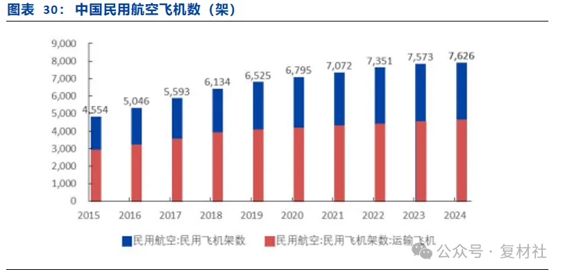 旅游业及交通运输业打开民航市场空间,我们预计 2035 年民航碳陶制动盘新增总需求约 24.0 万盘。随着中国经济逐渐向消费性经济过渡,航空业将在中国经济发展中起关键性作用。由于旅游业及交通运输业是未来服务业的重要领域,波音公司预测未来 20 年中国的年客运量增长率将达到 6.4%。波音公司预测中国民航机队规模到 2035 年单通道飞机将增至 5,110 架;未来 20 年宽体飞机规模将增至1,560 架新客机。按照军用飞机主机轮一般装配数量,1 架民用飞机 4 个刹车副,每副 9 个制动盘;1 架军用飞机 2 个主机轮装刹车副,每副 9 个制动盘。战斗机 4个/架,特种飞机 10 个/架,加油机 3 个/架,输送机 12 个/架,武装直升机 4 个/架,教练机 3 个/架。我们预计 2035 年民航机队碳陶制动盘新增总需求规模 24.0万盘。