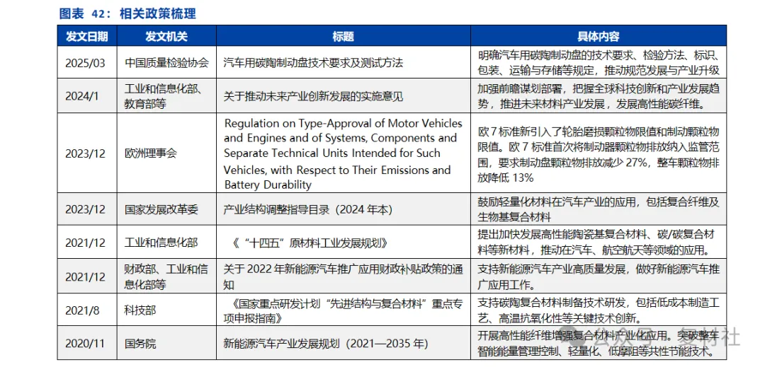 技术标准化牵引与法规强制替代加速碳陶制动盘放量。全球政策环境正加速碳陶制动盘的应用普及。欧盟“绿色协议”和美国 IRA 法案对汽车减排提出更高要求,中国“双碳”战略推动新能源汽车轻量化发展,政策导向使碳陶制动盘从奢侈品逐渐转变为关键技术选项。《汽车用碳陶制动盘技术要求及测试方法》首次统一材料性能、公差精度等核心指标,并通过标准化测试流程(如 AMS 试验、盐雾腐蚀测试)缩短主机厂验证周期。欧 7 首次将制动颗粒物纳入监管,碳陶制动盘凭借粉尘排放减少 90%的优势,成为合规可行方案。