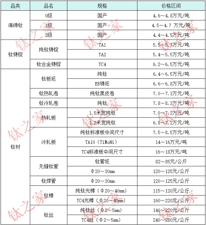注:以上价格由【钛之家】收集整理,并不代表企业间的最终成交价格,仅用于行业参考。如为此发生争议,【钛之家】不承担相关责任。