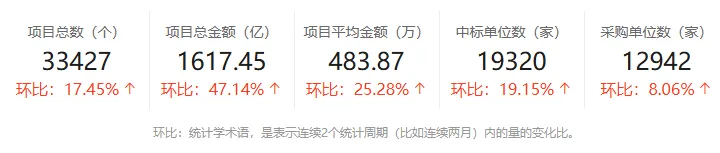 市场主体方面,本月中标企业总数为19320家,环比上月增长19.15%;完成招标采购的采购单位总数12942家,环比上月增长8.06%;