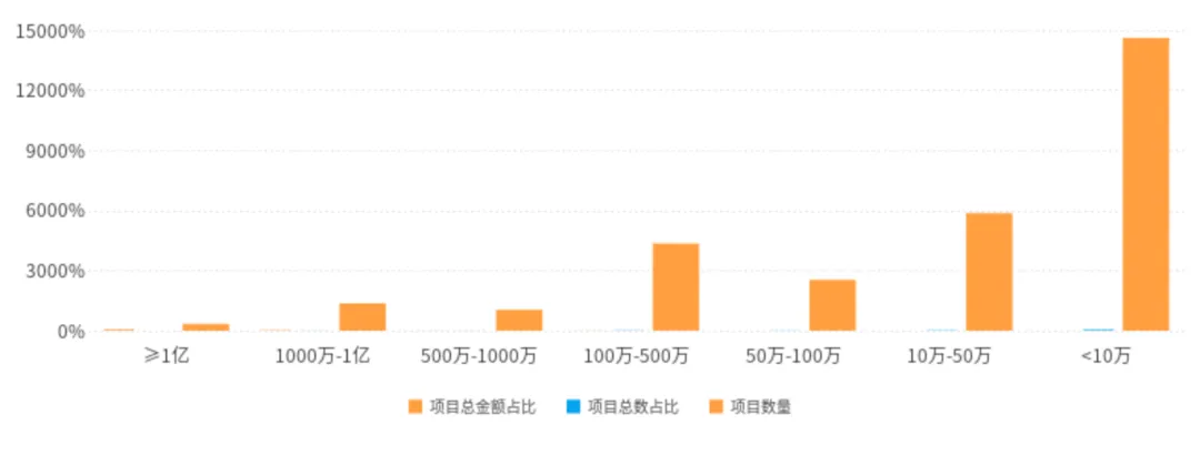 项目金额<10万的项目数量为:14630个;